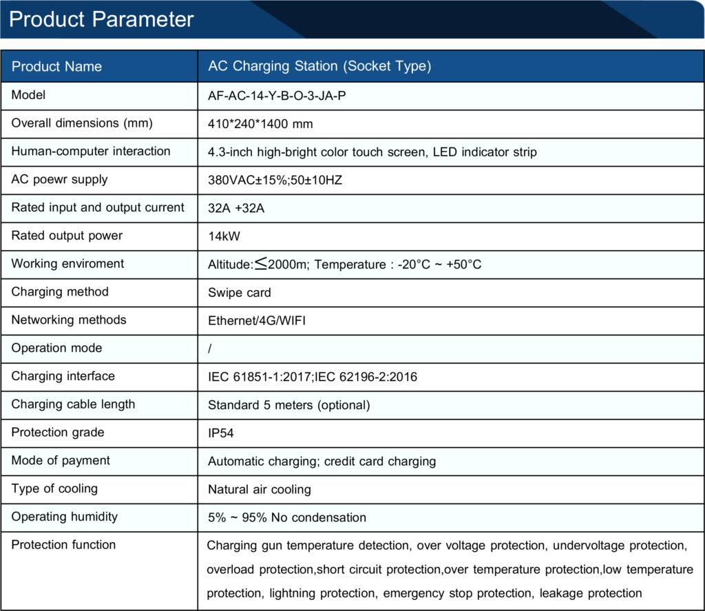 The AC charging station provides AC power with AC 50/60Hz and rated voltage 380V±15%.